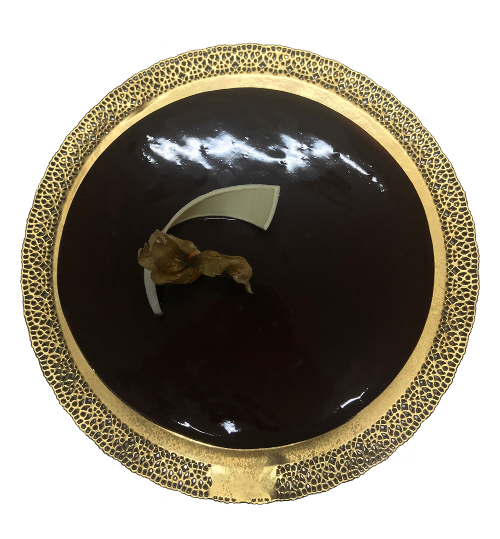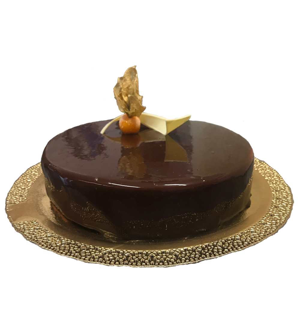Semifreddo Sacher con Gianduia e cuore di Albicocca glassata al Cioccolato fondente.